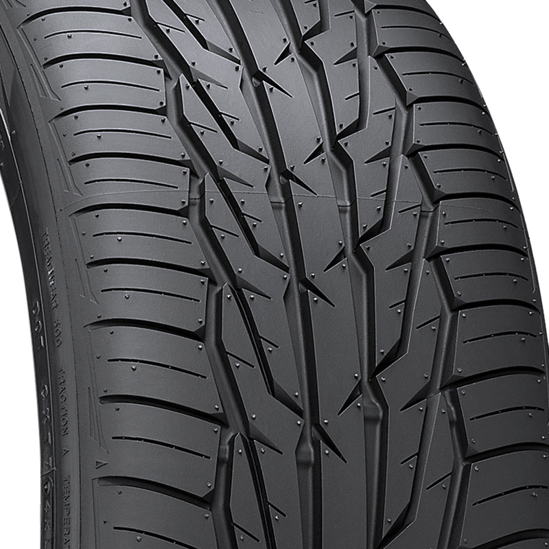The Toyo Extensa HP II is a high performance all season tire manufactured for passenger vehicles. Toyo offers a 45,000 mile warranty with this model. The tire promotes exceptional all weather traction. The silica-based tire compound maintains its flexibility in all weather, while the unidirectional tread design with the full depth multi-wave siping detail firmly grips the road surface in dry, wet and light winter weather. As a result, the tire can be used safely all year. The wide circumferential and interconnecting swooping grooves effectively disperse water from below the tire footprint to avoid hydroplaning situations.