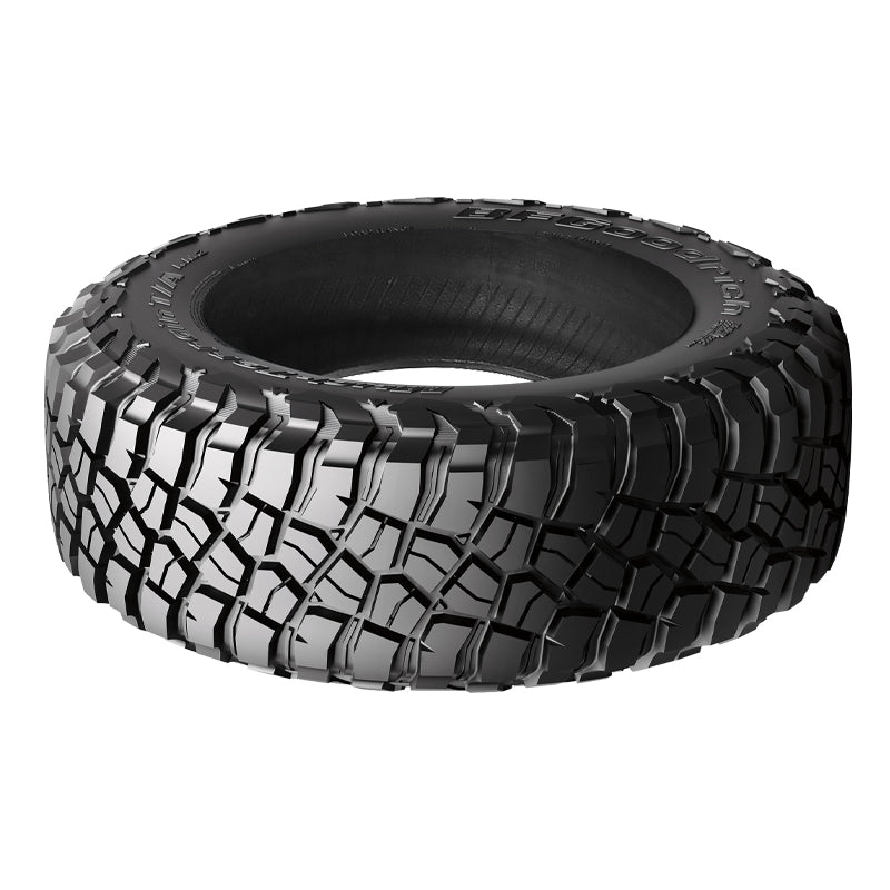 The BFGoodrich Mud-Terrain T/A KM3 is a mud terrain all season tire manufactured for light trucks. The tire ensures excellent off-road performance. The Terrain-Attack tread design’s large tread blocks improve the soft and loose terrain traction and also enable the model to maintain a firm grip on uneven terrain surfaces. In this manner, the tread enhances the tire’s usability on all off-road conditions. The staggered shoulder design increases the tire’s forward movement in deep mud and loose dirt, promoting better controllability. The tread pattern’s wide grooves feature Mud-Phobic bars that manage to keep the tire’s footprint clean. They eliminate mud and snow and eject rocks stuck between the tread elements. This resists stone retention from harming the tire and prevents the tread area from being blocked from its contact with the road surface.