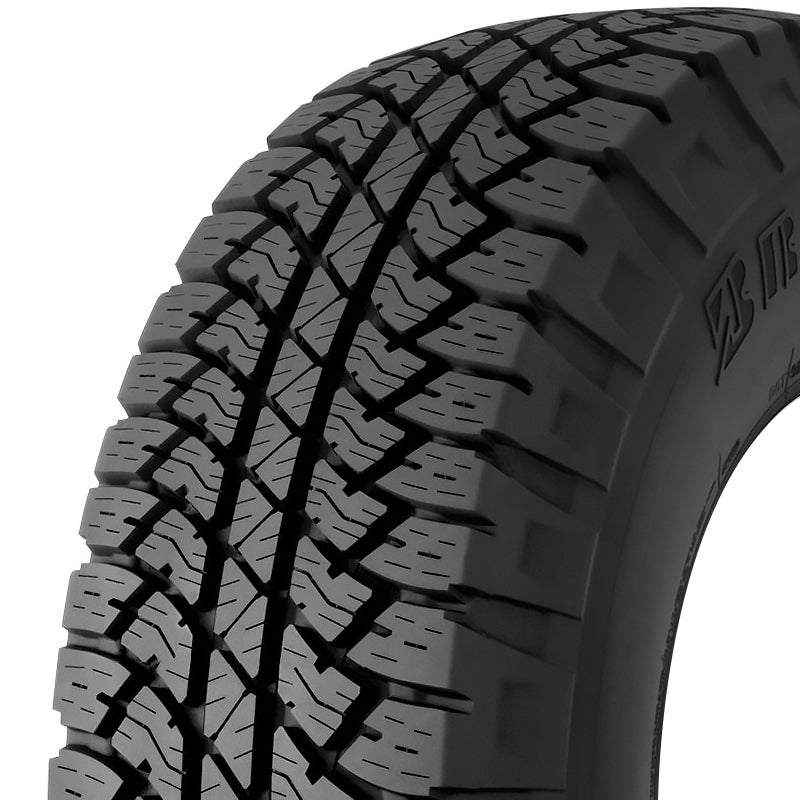 The Bridgestone Dueler A/T RH-S is an all season all terrain tire manufactured for SUV, crossover and light truck vehicles. This model offers excellent all terrain traction. The off-shoulder tread design helps the tire grip the road surface more firmly on all surface conditions. The tire’s all terrain capability is enhanced this way, as it can conquer all uneven, loose or soft terrains. While most all terrain tires are not recommended for use in mud, this model can perform well. It is worth noting, however, that prolonged use on muddy terrain can become dangerous, as the mud packs up in the tread grooves, lowering the model’s grip. This tire is perfect for drivers with diverse needs. It performs well in both on- and -off-road conditions as well, such as dirt or gravel paths.