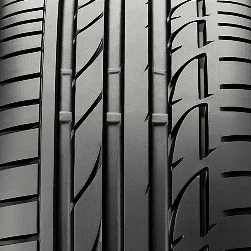 The Bridgestone Potenza S001 is a high performance summer tire manufactured for passenger vehicles. The tire offers superb summer weather traction and it grips the road well in dry and wet weather. This great traction is the result of the slanted-slug tread block sipes in the tread pattern. The tire is not recommended for use in winter conditions, as the tire compound loses its traction in colder temperatures. The tire’s three wide circumferential grooves help resist dangerous hydroplaning situations by dispersing water from beneath the footprint. The tire is safer to use in summer weather conditions thanks to these enhancements.