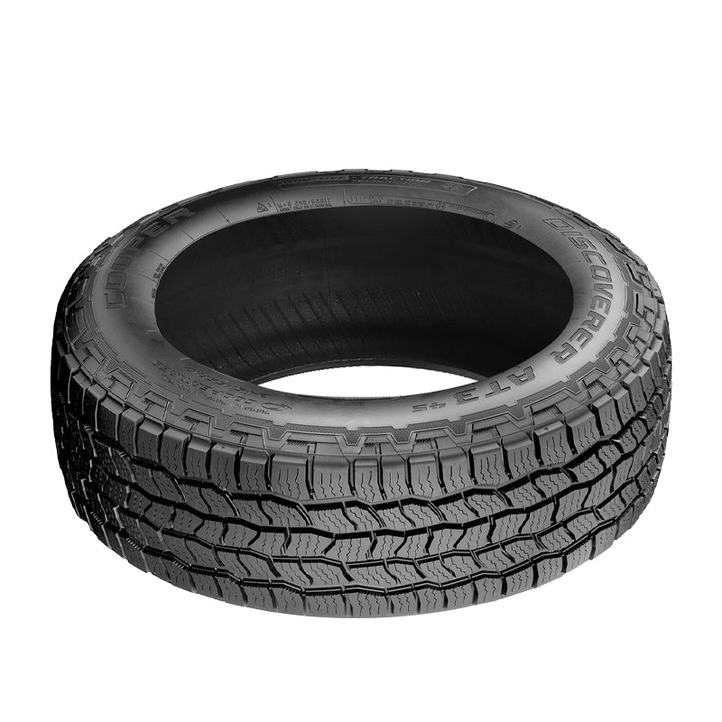 The Cooper Discoverer AT3 4S is an all terrain, all season tire manufactured for crossover vehicles and SUVs. Cooper offers a 65,000 mile treadwear warranty with this model. The tire promotes great all weather traction. The tread design features sawtooth snow groove edges and zigzag grooves that find firm grip in dry, wet and winter weather road conditions. The Adaptive Traction (AT) Technology combines the special five-rib tread design with the silica-based tire compound that ensure a safer driving experience. The compound maintains its flexibility even in colder temperatures, while the tread elements firmly grip the road surface all year. The Aqua Vac Channel and the unique center grooves avoid hydroplaning by dispersing water and slush from below the tire’s footprint. The enhanced hydroplaning resistance and exceptional all weather traction promote a safer driving experience.