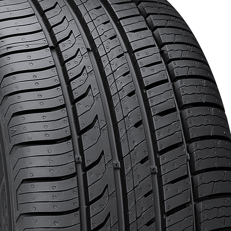 The Kumho Ecsta PA51 is a performance and high performance, depending on the speed rating, all season tire manufactured for passenger vehicles. The tire promotes great all weather traction. The silica-based tire compound and the asymmetric tread pattern increases the tire’s grip on dry, wet and winter weather roads. The silica in the tire’s rubber material maintains its flexibility in various weather, including in colder temperatures. The asymmetric tread’s siping and notch pattern helps improve the grip the tire has on the road surface. These tread elements heighten the number of biting edges gripping the road surface which guarantees a secure driving experience. The circumferential grooves prevent hydroplaning by dispersing water and slush from below the tire’s footprint. The better traction and hydroplaning prevention guarantee a secure driving experience.